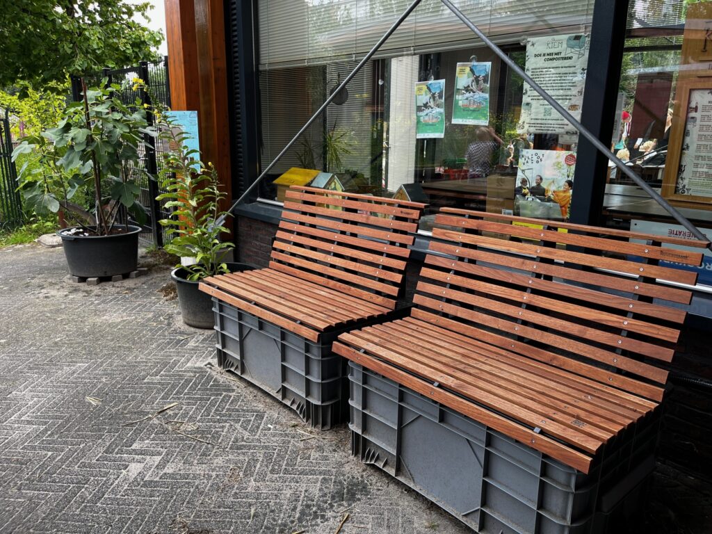 Met deze bank willen we demonstreren dat je met slimme oplossingen twee vliegen in een klap kunt vangen. Zowel lekker zitten als regenwater opvangen. De meeste regentonnen nemen veel ruimte in beslag. Als je weinig ruimte hebt is dat zonde. Met dit bankje kan je ook nog lekker zitten. Probeer hem zelf uit op bij Wijkboerderij Wachterlied.
