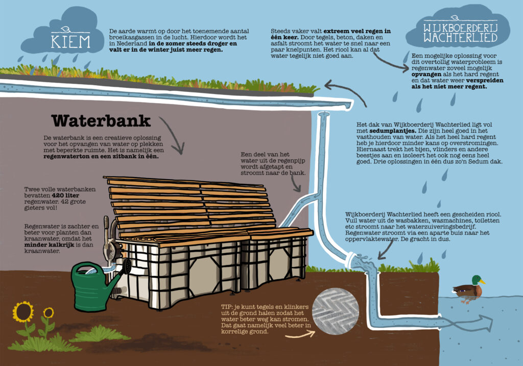 Binnen Wijkboerderij Wachterlied staat een heuse Waterbank. Een oplossing voor het probleem van overtollig water in de stad als je weinig ruimte hebt in je tuin. Ik mocht het informatiebord ontwerpen.